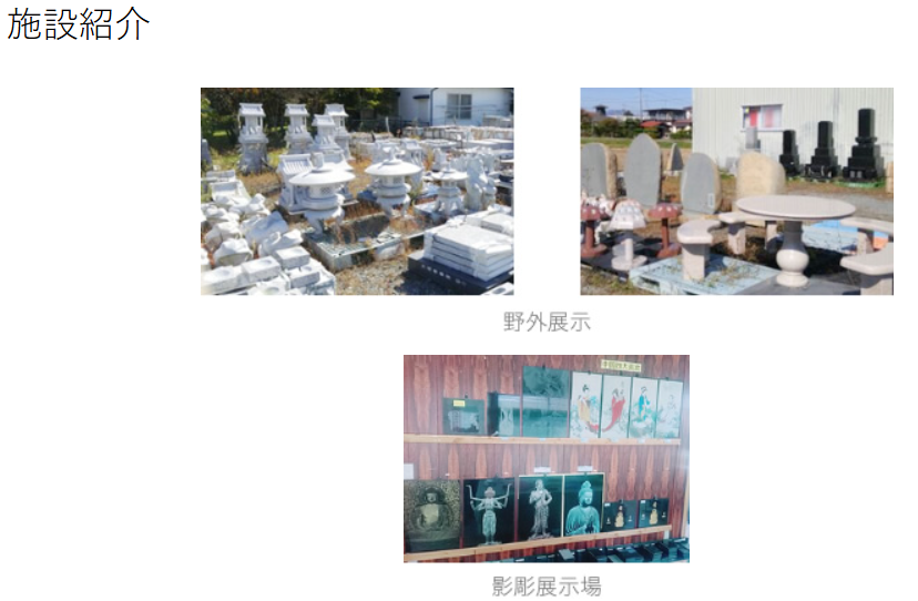 展示品目外柵・高級石塔・上下蓮華・灯篭・地蔵・氏神・小物彫刻・影彫等